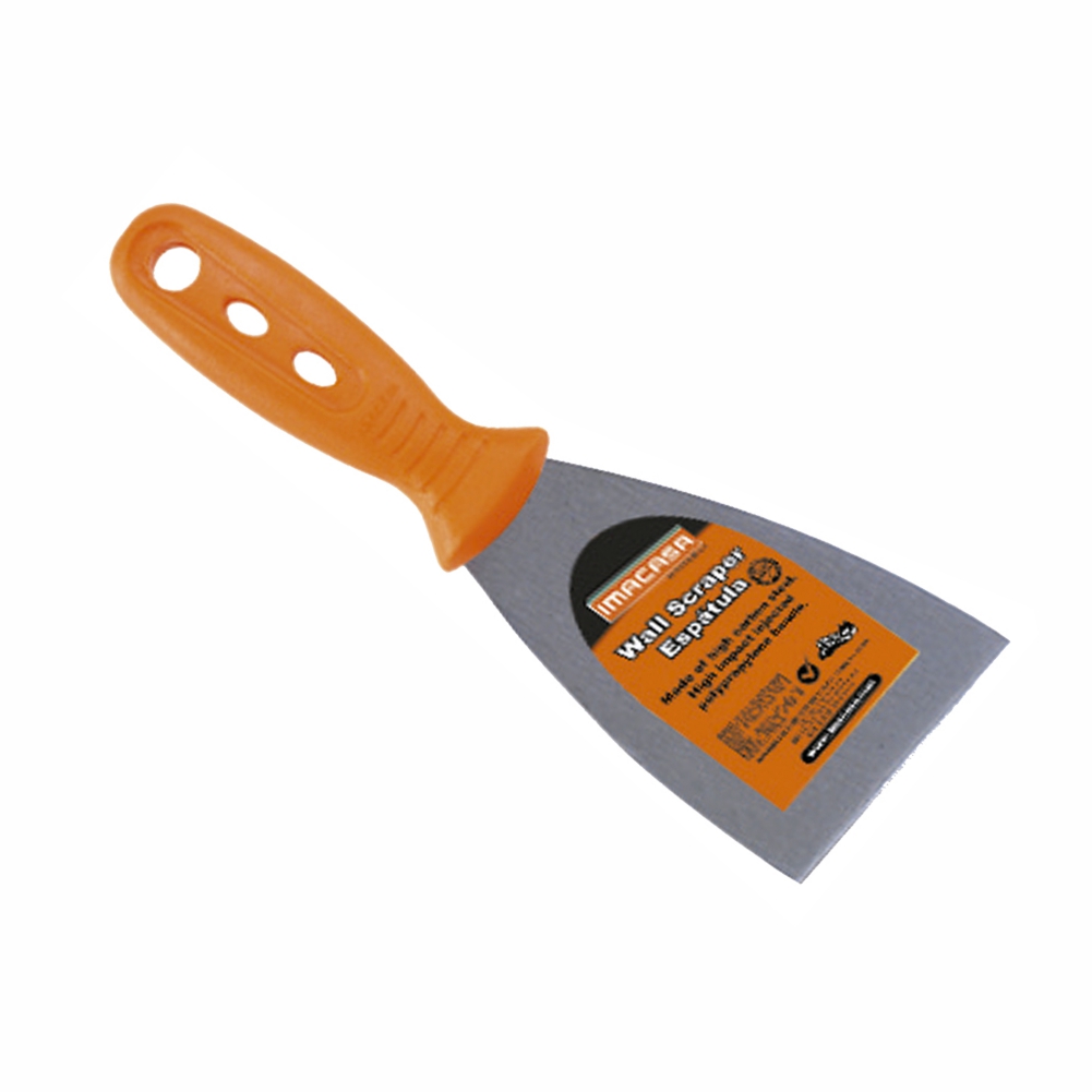Hoja de metal ancha, fina y flexible para limpiar, alisar y levantar incrustaciones. Espátula metálica rígida. De mango unida por remaches y perforación en el mango para fácil almacenaje.